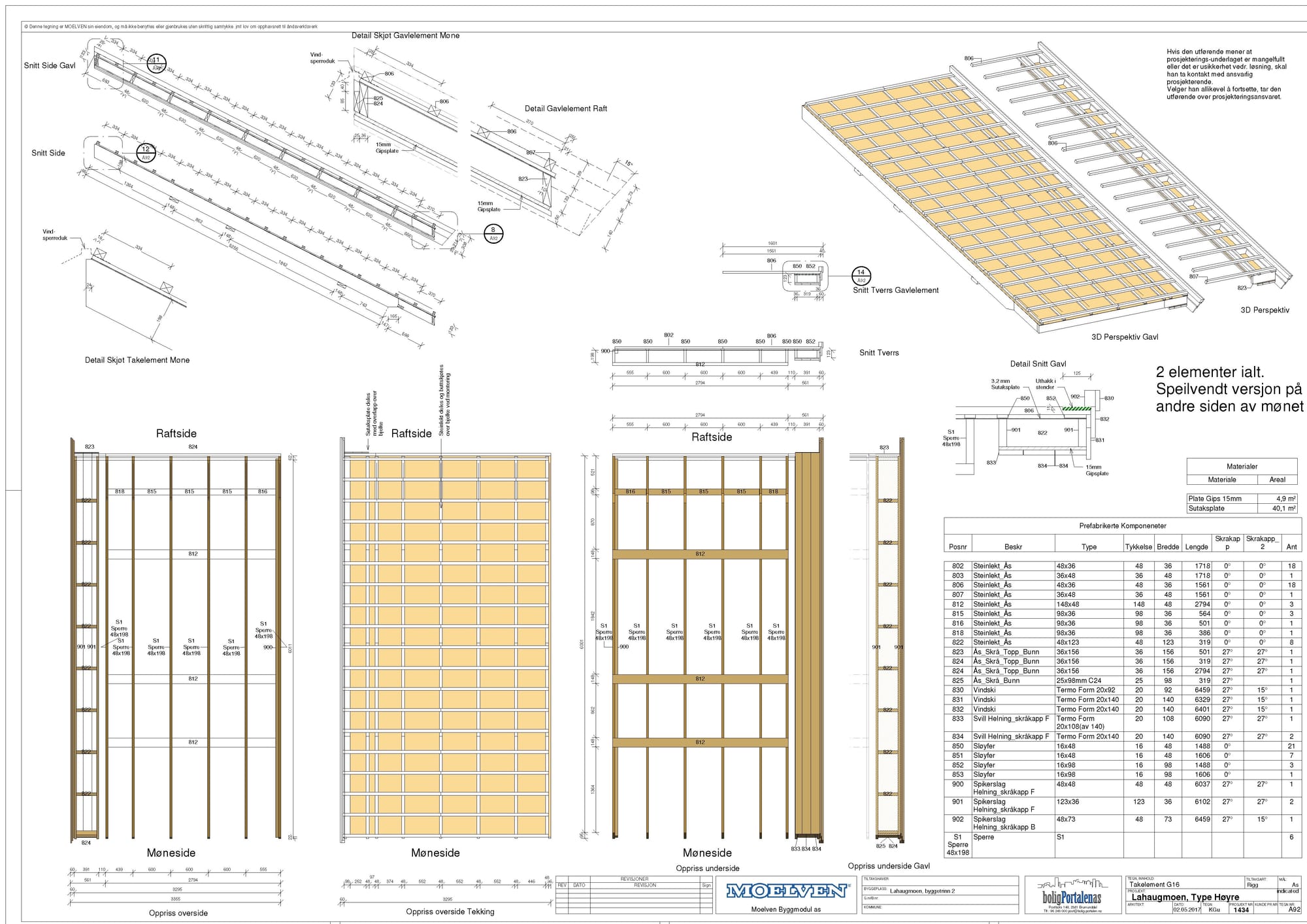 Beskrivelser og tegninger som underlag for tak og veggelementer. Inkluderer målsatte skisser, beskrivelse av komponenter, stykklister, detaljer for elementer og montasje samt stykklister